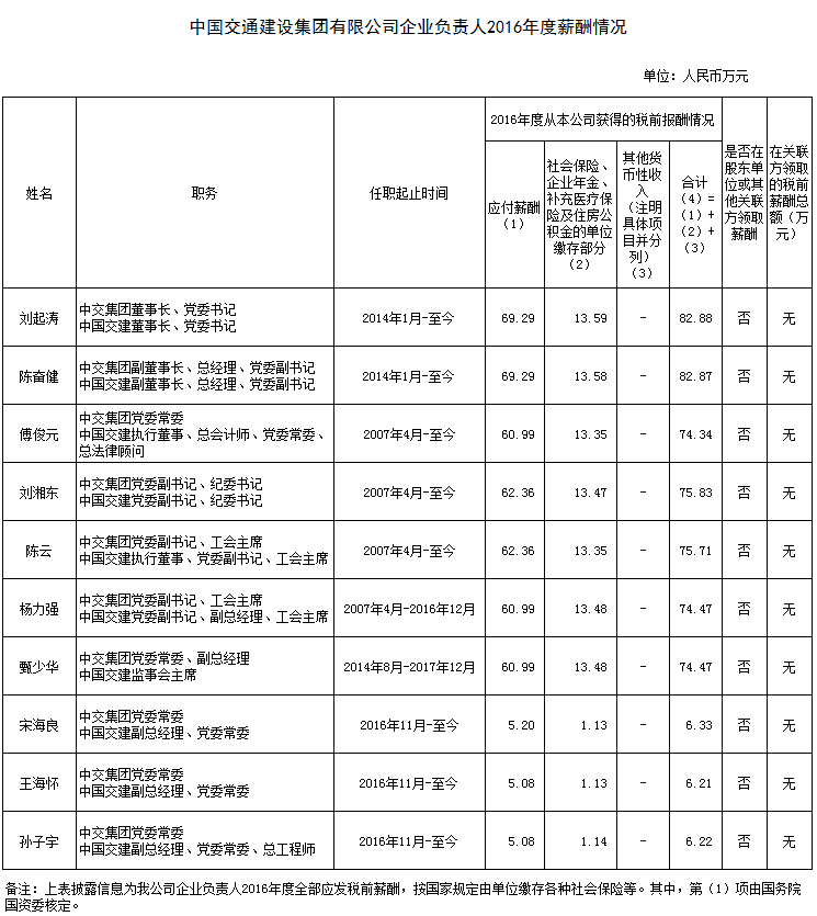 按照深化國有企業負責人薪酬制度改革的有關要求和國資委的具體規定,現將中國交通建設集團有限公司企業負責人2016年度薪酬信息披露如下: