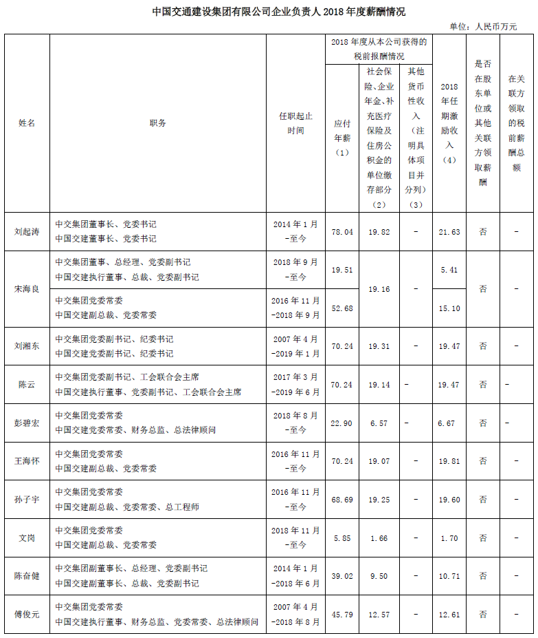 按照深化國(guó)有企業(yè)負(fù)責(zé)人薪酬制度改革有關(guān)要求和國(guó)資委相關(guān)規(guī)定,現(xiàn)將中國(guó)交通建設(shè)集團(tuán)有限公司企業(yè)負(fù)責(zé)人2018年度薪酬情況披露如下: