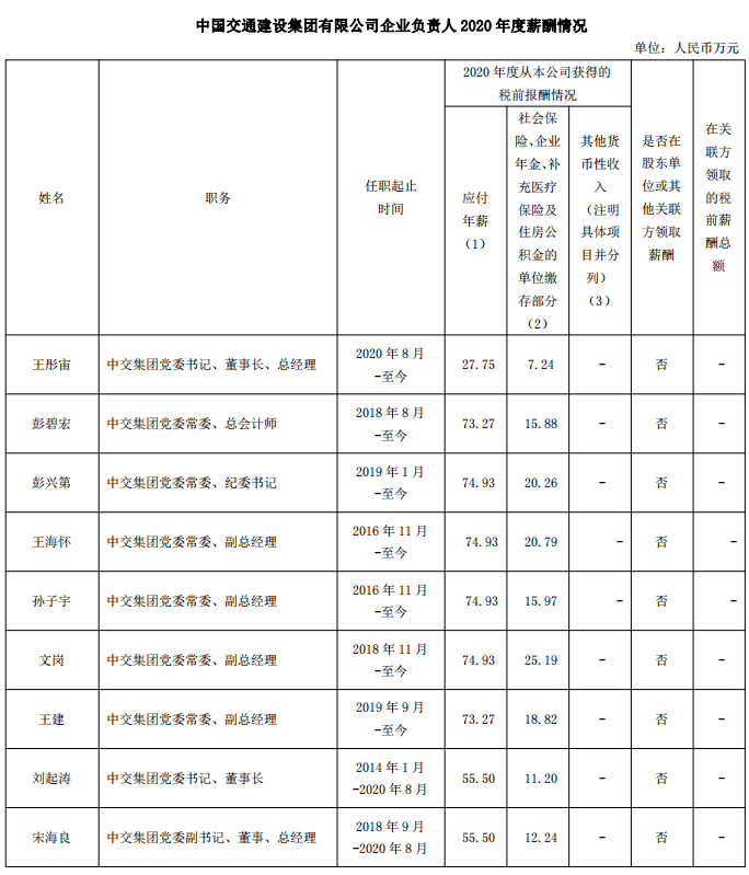 關于披露中國交通建設集團有限公司企業負責人2020年薪酬情況的公告
