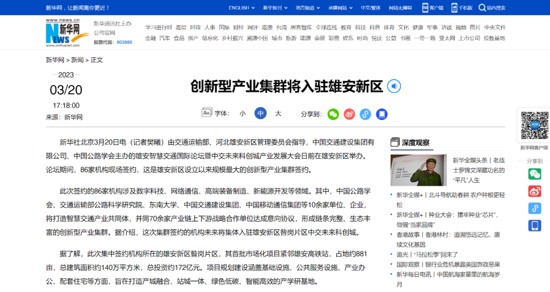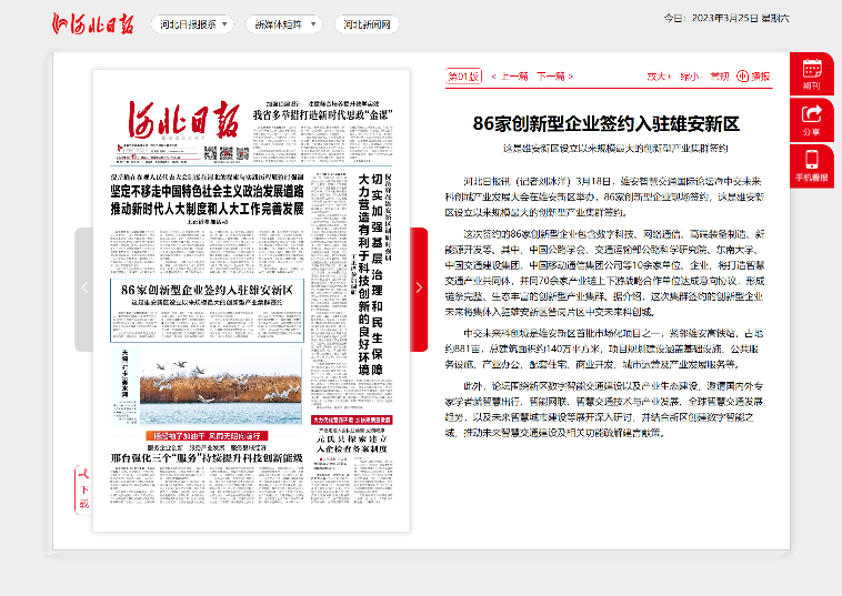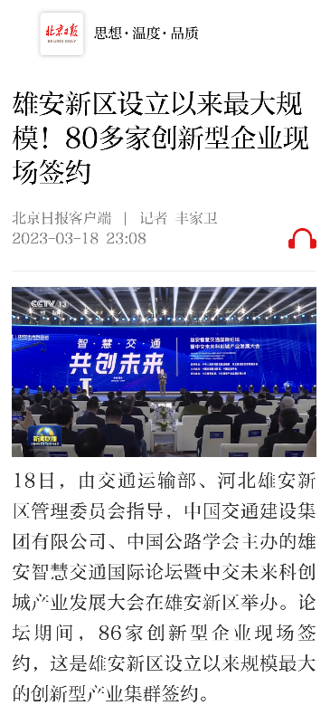 北京商報刊發(fā)報道,雄安新區(qū),千年大計,這座新時代“未來之城”正從規(guī)劃藍(lán)圖變?yōu)楝F(xiàn)實樣板。這不僅是雄安新區(qū)設(shè)立以來規(guī)模最大的創(chuàng)新型產(chǎn)業(yè)集群簽約,也是雄安新區(qū)首次以市場化方式引導(dǎo)打造的智慧交通產(chǎn)業(yè)生態(tài)。