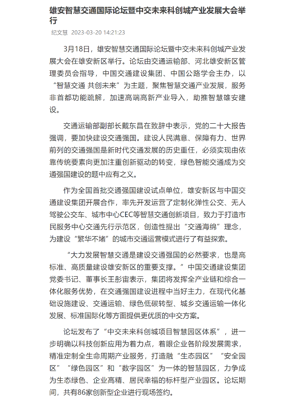 雄安智慧交通國際論壇暨中交未來科創(chuàng)城產(chǎn)業(yè)發(fā)展大會舉辦80多家創(chuàng)新型企業(yè)現(xiàn)場簽約