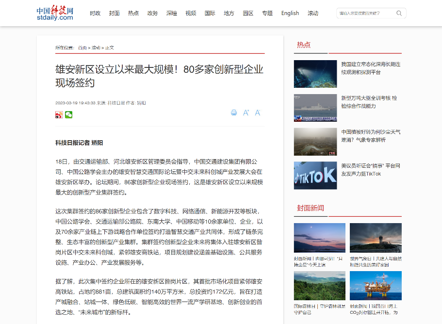 中國發(fā)展網(wǎng)刊發(fā)報道,論壇期間,雄安新區(qū)首批市場化項目中交未來科創(chuàng)城啟動全球招商,共有86家創(chuàng)新型企業(yè)現(xiàn)場簽約,包含了基礎(chǔ)設(shè)施、數(shù)字科技、網(wǎng)絡(luò)通信、高端裝備制造、新能源開發(fā)、航天科工、綠色金融服務(wù)等多個板塊,是雄安新區(qū)設(shè)立以來規(guī)模最大的創(chuàng)新型產(chǎn)業(yè)集群入駐。