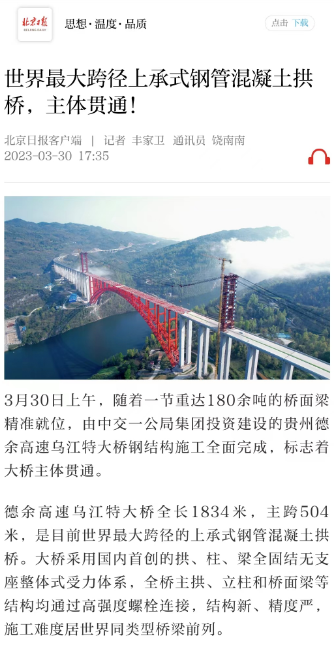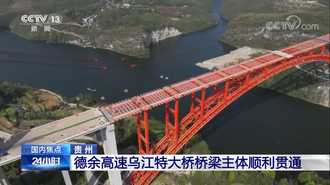 德余高速烏江特大橋全長1834米,主跨504米,是目前世界最大跨徑的上承式鋼管混凝土拱橋。大橋采用國內首創的拱、柱、梁全固結無支座整體式受力體系,全橋主拱、立柱和橋面梁等結構均通過高強度螺栓連接,結構新、精度嚴,施工難度居世界同類型橋梁前列。