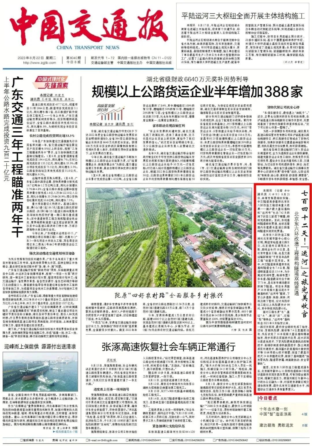 中國交通報頭版新聞報道北京東六環改造工程雙線貫通。