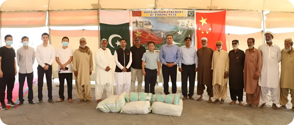 瓜達爾東灣快速路項目部向瓜達爾當?shù)貪O民捐贈587套漁網(wǎng),為當?shù)亟?00戶貧困家庭改善“出海捕魚”這一賴以生存的謀生渠道。